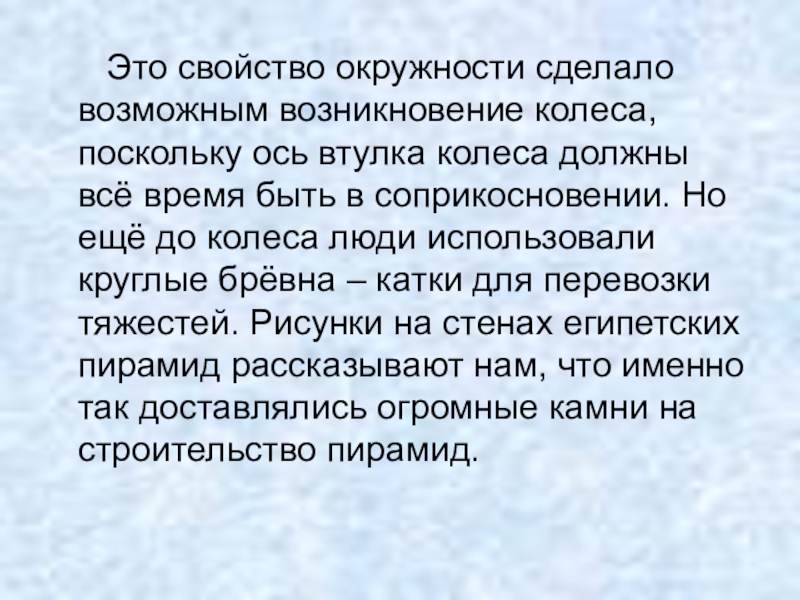 Слайд 3 Это свойство окружности сделало возможным возникновение колеса, поскольку
