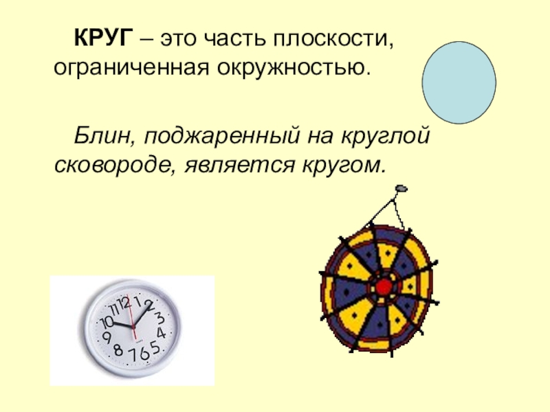 КРУГ – это часть плоскости, ограниченная окружностью.   Блин, поджаренный на круглой сковороде,