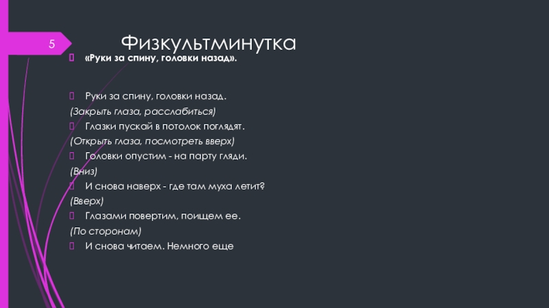 Физкультминутка«Руки за спину, головки назад». Руки за спину, головки назад.(Закрыть глаза, расслабиться)Глазки пускай в потолок поглядят.(Открыть глаза,