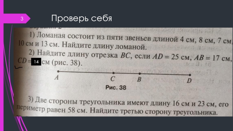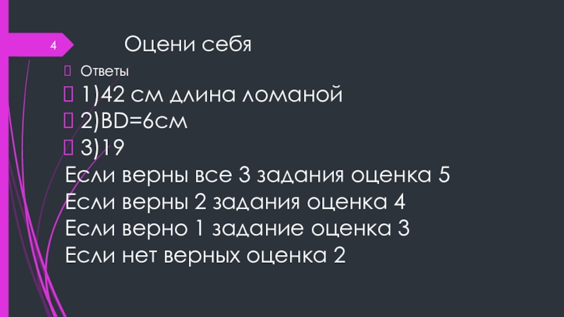 Оцени себяОтветы 1)42 см длина ломаной2)ВD=6см3)19Если верны все 3 задания оценка 5Если верны 2 задания оценка 4Если