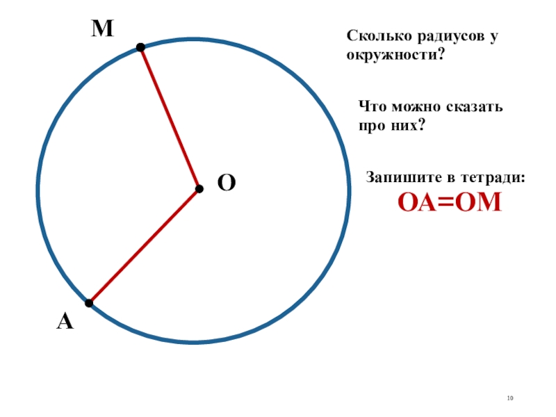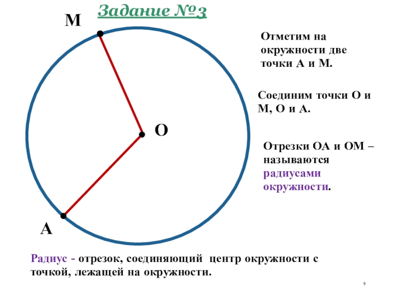 Радиус - отрезок, соединяющий центр окружности с точкой, лежащей на окружности.