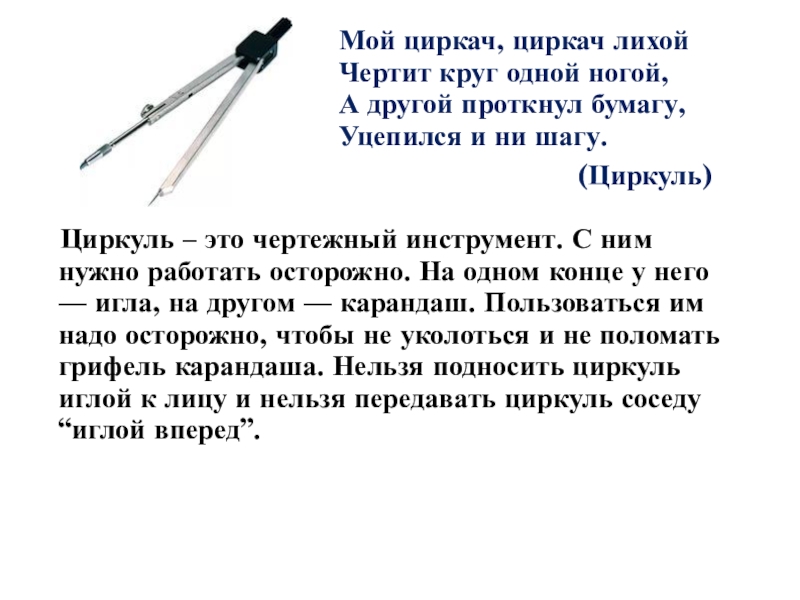 Циркуль – это чертежный инструмент. С ним нужно работать осторожно. На одном конце у него — игла, на другом — карандаш. Пользоваться им надо осторожно, чтобы не уколоться и не поломать грифель карандаша. Нельзя подносить циркуль иглой к лицу и нельзя передавать циркуль соседу “иглой вперед”.