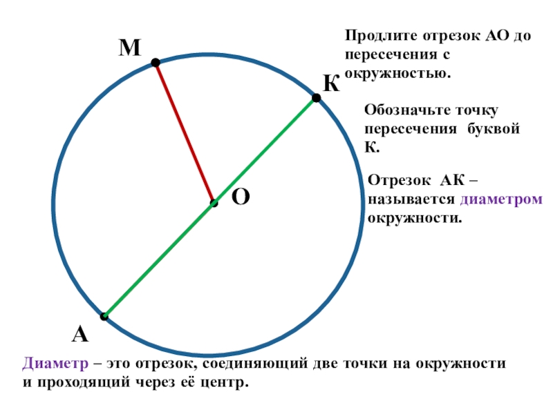 Диаметр – это отрезок, соединяющий две точки на окружности и проходящий через её центр.