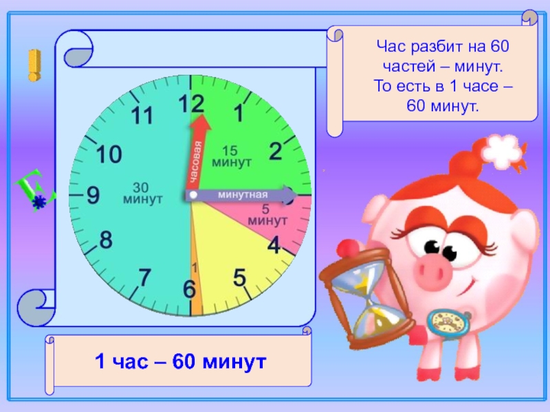 1 час – 60 минутЧас разбит на 60 частей – минут. То есть в 1 часе –