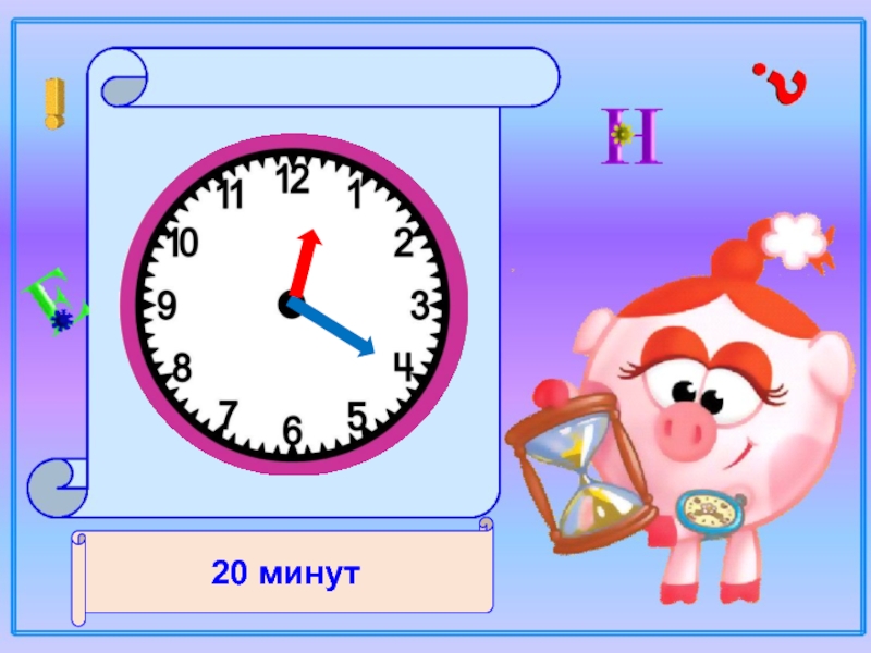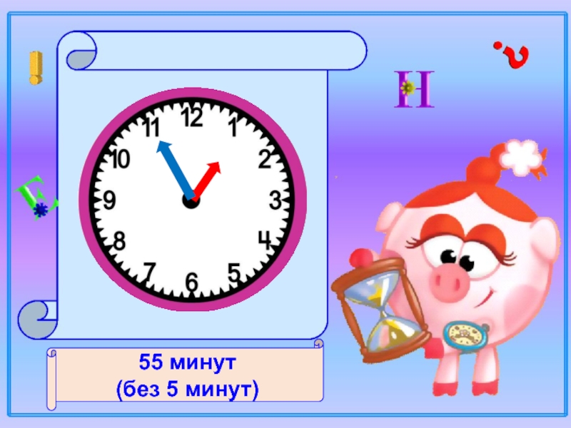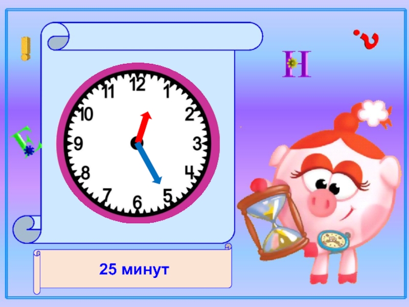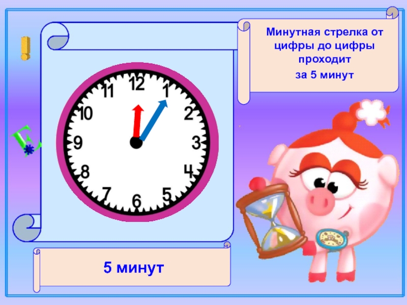 Слайд 7Через 5 минут большая стрелка пробежит 5 делений, а маленькая –