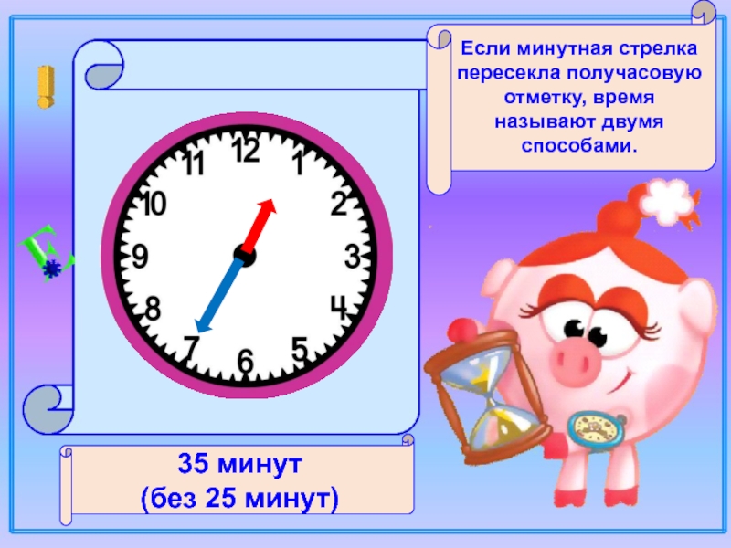 35 минут(без 25 минут)Если минутная стрелка пересекла получасовую отметку, время называют двумя способами.