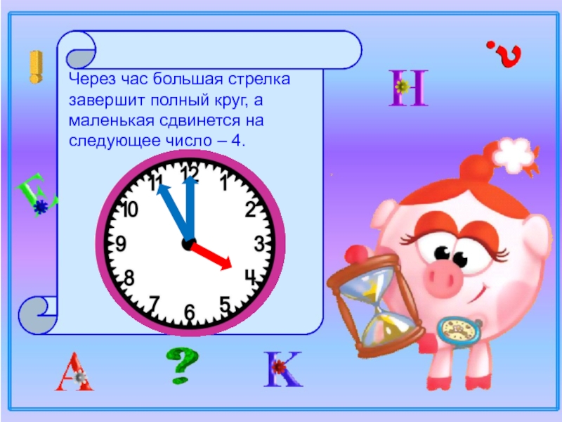 Слайд 8Через час большая стрелка завершит полный круг, а маленькая сдвинется на