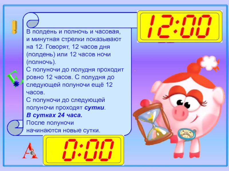 Слайд 9В полдень и полночь и часовая, и минутная стрелки показывают на