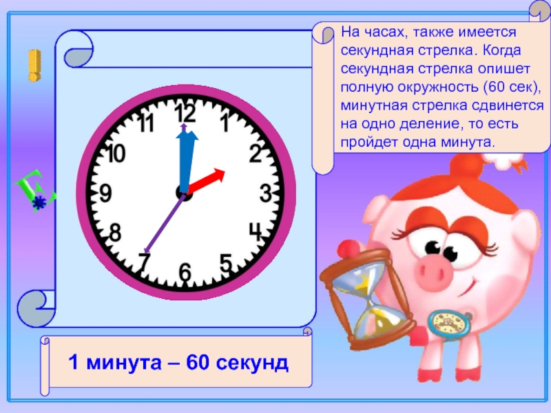 1 минута – 60 секундНа часах, также имеется секундная стрелка. Когда секундная стрелка опишет полную окружность (60