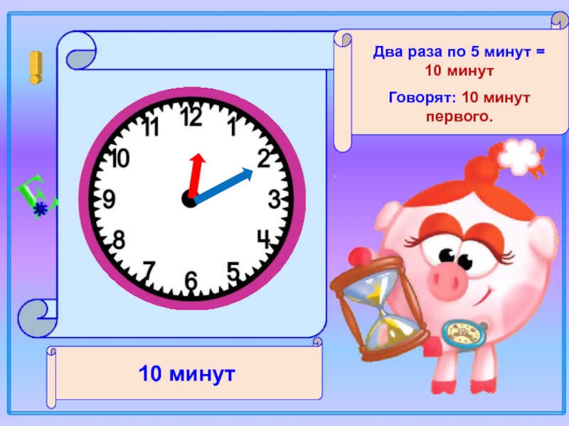 10 минутДва раза по 5 минут = 10 минут Говорят: 10 минут первого.