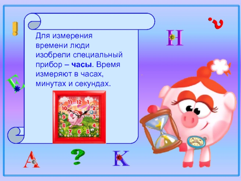 Для измерения времени люди изобрели специальный прибор – часы. Время измеряют в часах, минутах и секундах.