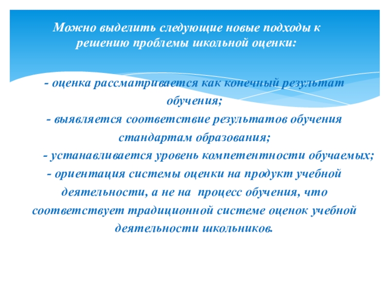 Можно выделить следующие новые подходы к решению проблемы школьной оценки: