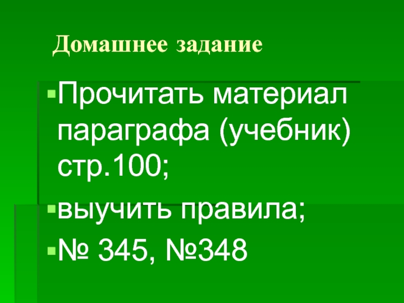 Домашнее заданиеПрочитать материал параграфа (учебник) стр.100; выучить правила; № 345, №348