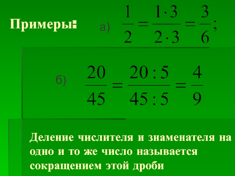 Примеры: а) б) Деление числителя и знаменателя на одно и то же число называется сокращением этой дроби