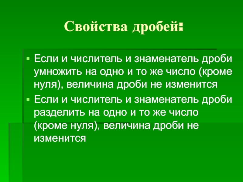 Свойства дробей:Если и числитель и знаменатель дроби умножить на одно и то же число (кроме нуля), величина