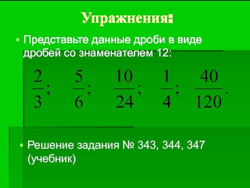 Упражнения: Представьте данные дроби в виде дробей со знаменателем 12:Решение задания № 343, 344, 347 (учебник)