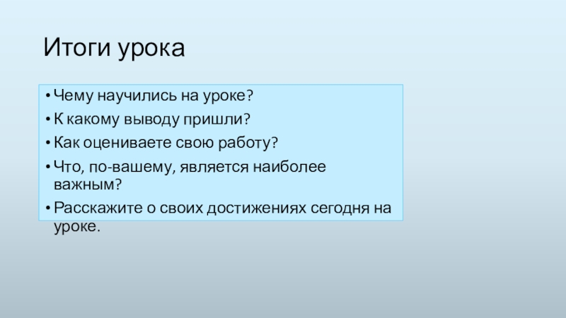 Итоги урокаЧему научились на уроке?К какому выводу пришли?Как оцениваете свою работу?Что, по-вашему, является наиболее важным?Расскажите о своих