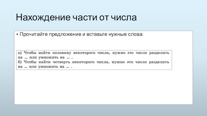 Нахождение части от числаПрочитайте предложение и вставьте нужные слова: