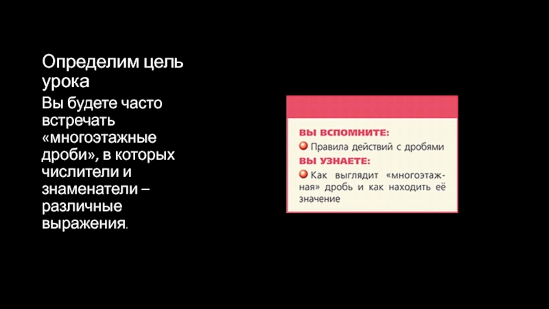 Определим цель урокаВы будете часто встречать «многоэтажные дроби», в которых числители и знаменатели – различные выражения.