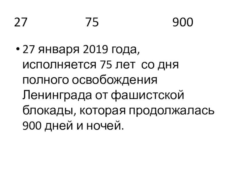 27 января 2019 года, исполняется 75 лет со дня полного освобождения Ленинграда от фашистской блокады, которая продолжалась 900 дней и ночей.