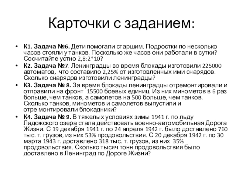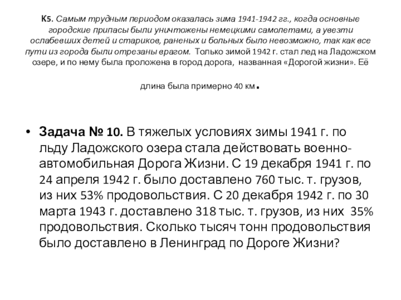 Задача № 10. В тяжелых условиях зимы 1941 г. по льду Ладожского озера стала действовать военно-автомобильная Дорога Жизни. С 19 декабря 1941 г. по 24 апреля 1942 г. было доставлено 760 тыс. т. грузов, из них 53% продовольствия. С 20 декабря 1942 г. по 30 марта 1943 г. доставлено 318 тыс. т. грузов, из них 35% продовольствия. Сколько тысяч тонн продовольствия было доставлено в Ленинград по Дороге Жизни?