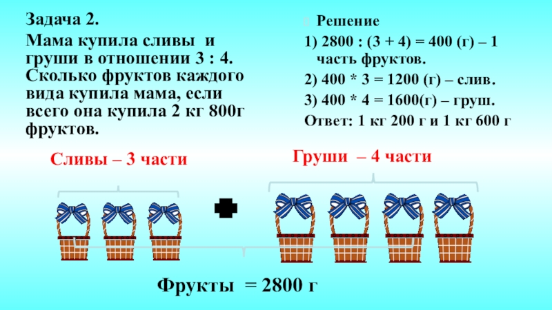 1) 2800 : (3 + 4) = 400 (г) – 1 часть фруктов.