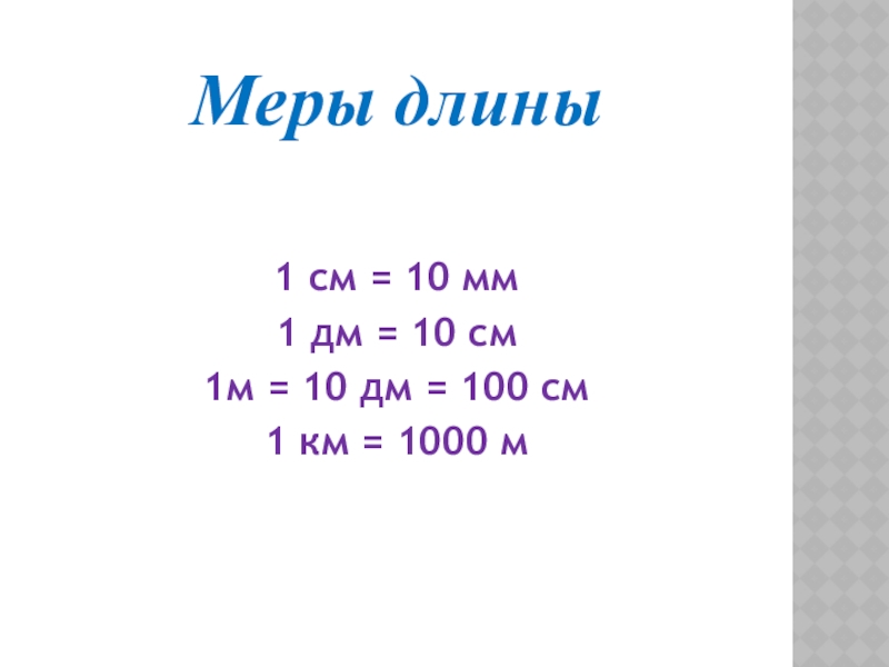 Меры длины1 см = 10 мм1 дм = 10 см1м = 10 дм = 100 см1 км