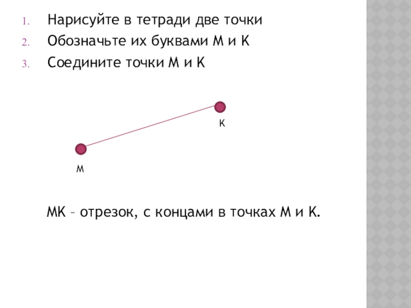 Нарисуйте в тетради две точкиОбозначьте их буквами M и KСоедините точки M и K   MK