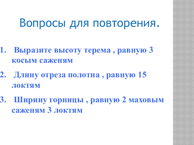 Вопросы для повторения. Выразите высоту терема , равную 3 косым саженям Длину отреза полотна , равную 15