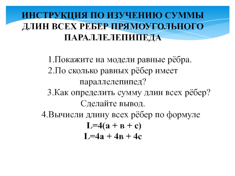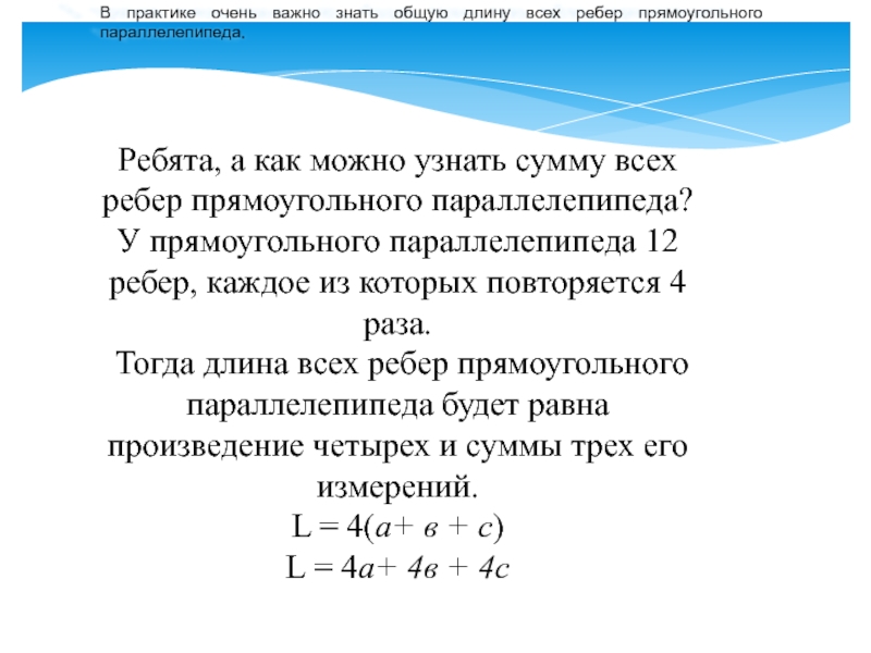 Тогда длина всех ребер прямоугольного параллелепипеда будет равна произведение четырех и суммы трех его измерений.