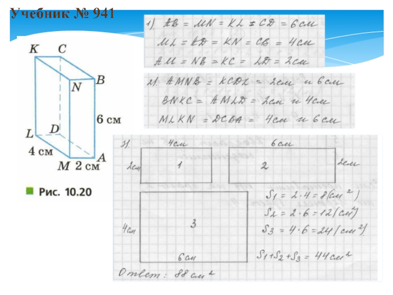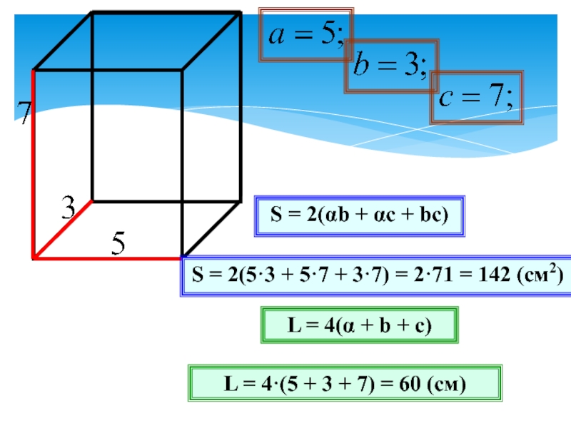S = 2(5·3 + 5·7 + 3·7) = 2·71 = 142 (см2)