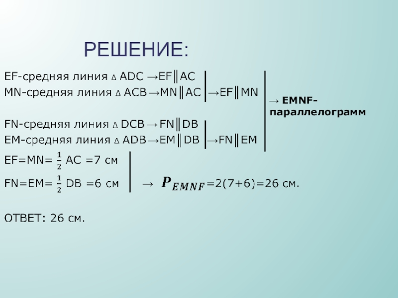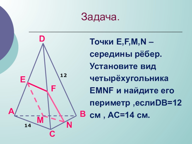 Точки Е,F,M,N – середины рёбер.Установите вид четырёхугольника ЕМNF и найдите его периметр ,еслиDB=12 см , АС=14 см.