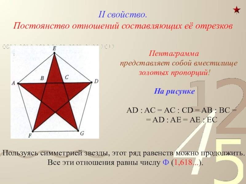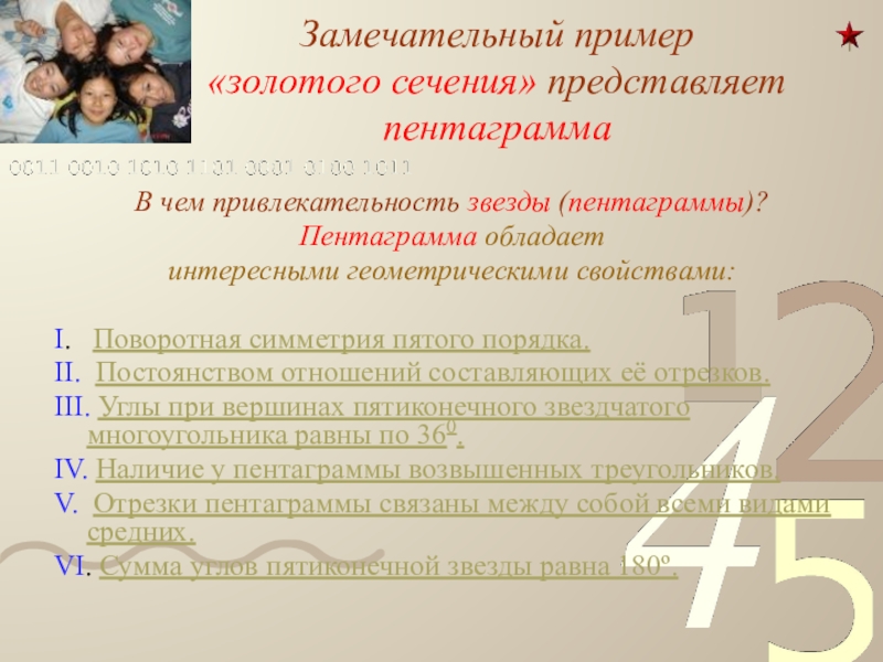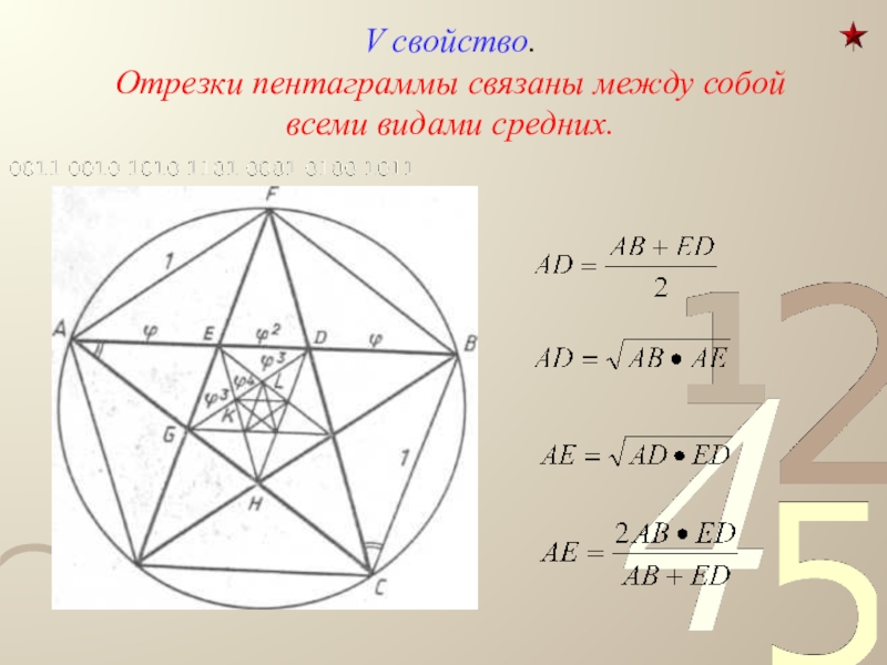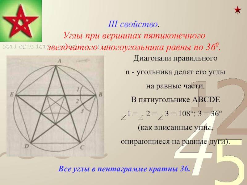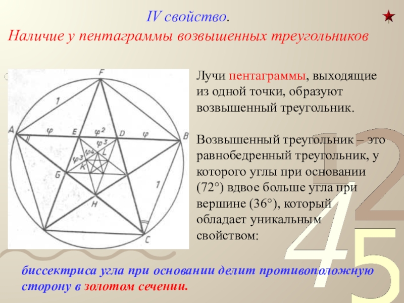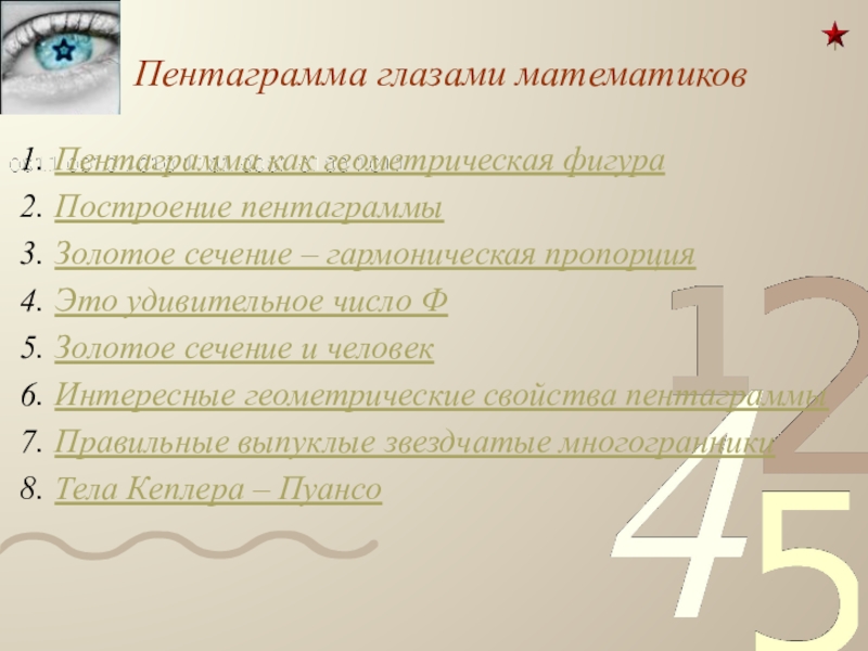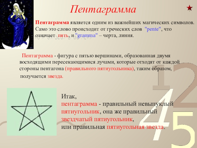 Пентаграмма - фигура с пятью вершинами, образованная двумя восходящими пересекающимися лучами, которые отходят от каждой стороны пентагона (правильного пятиугольника), таким образом,