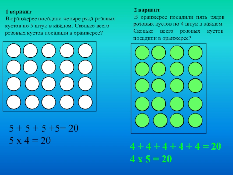 В оранжерее посадили пять рядов розовых кустов по 4 штук в каждом. Сколько всего розовых кустов посадили в оранжерее?