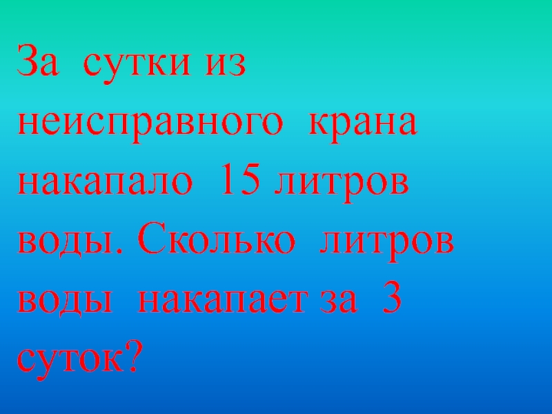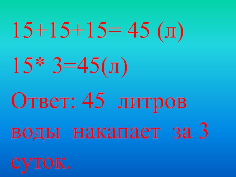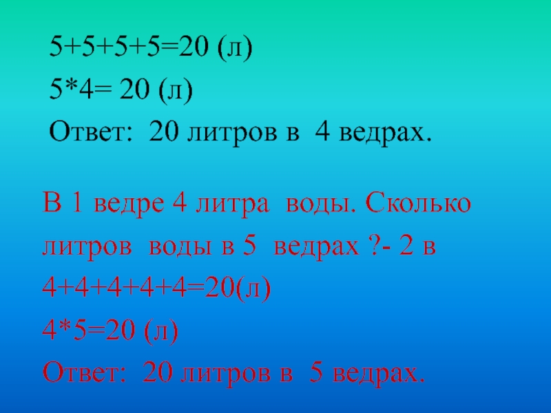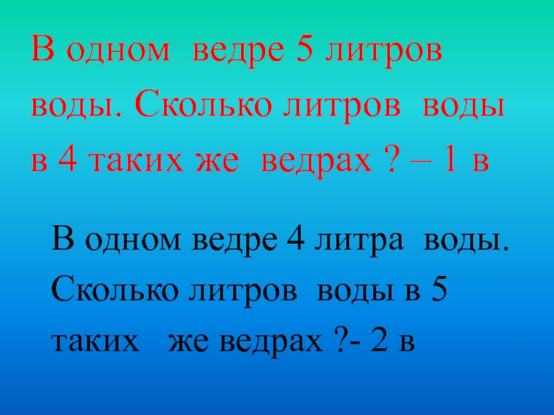 В одном ведре 4 литра воды. Сколько литров воды в 5 таких же ведрах ?- 2 в
