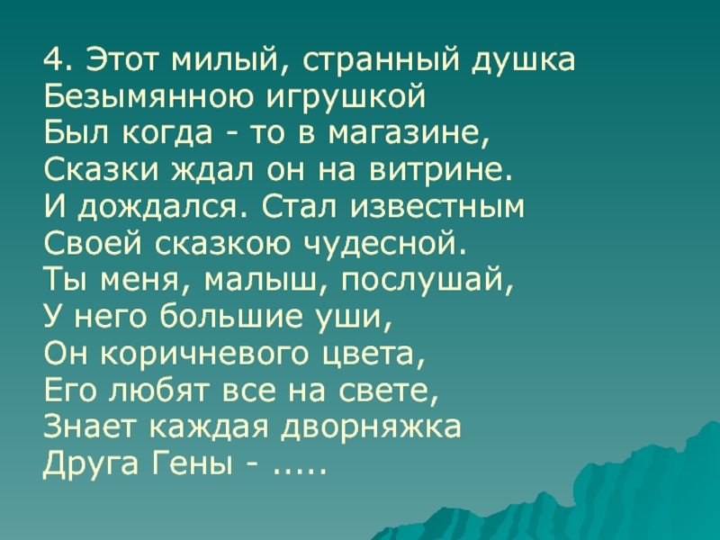 4. Этот милый, странный душкаБезымянною игрушкойБыл когда - то в магазине,Сказки ждал он на витрине.И дождался. Стал