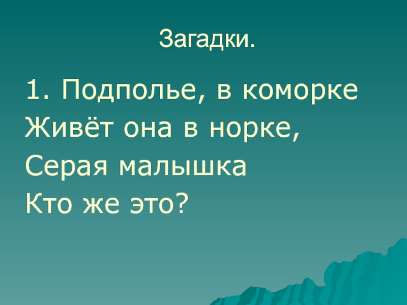 Загадки.1. Подполье, в коморкеЖивёт она в норке,Серая малышкаКто же это?
