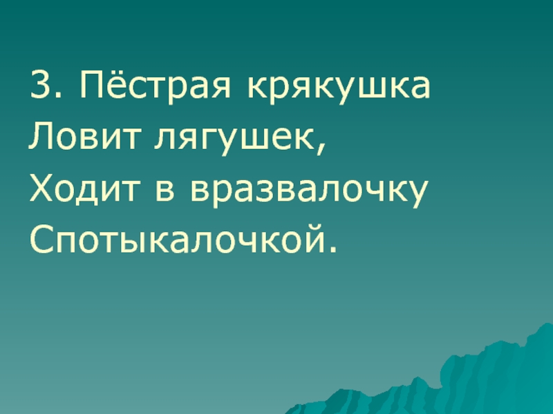 3. Пёстрая крякушкаЛовит лягушек,Ходит в вразвалочкуСпотыкалочкой.