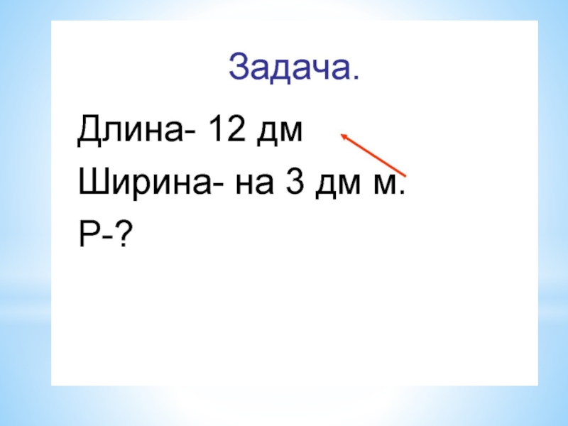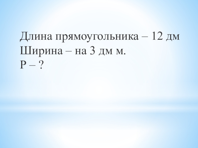 Слайд 6Длина прямоугольника – 12 дм Ширина – на 3 дм м. Р –