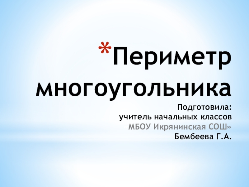 Слайд 1Периметр многоугольника Подготовила: учитель начальных классов «МБОУ Икрянинская СОШ» Бембеева Г.А.