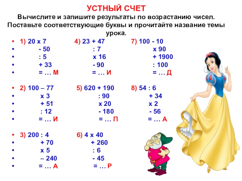 2) 100 – 77 5) 620 + 190 8) 54 : 6