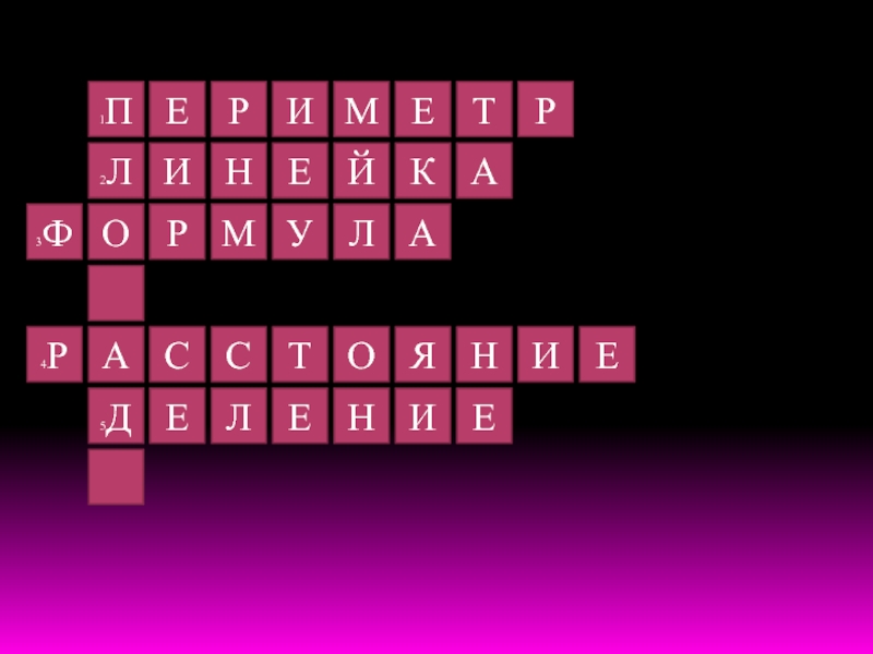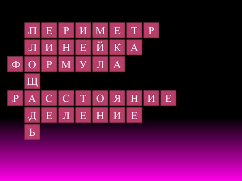 1ПЕРИМЕТР2ЛИНЕЙКАО3ФРМУЛАЩА4РССТОЯНИ5ДЕЛЕНИЬЕЕ