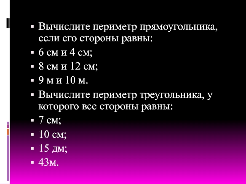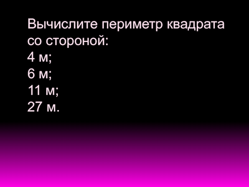 Слайд 4Вычислите периметр квадрата со стороной: 4 м; 6 м; 11 м; 27 м.