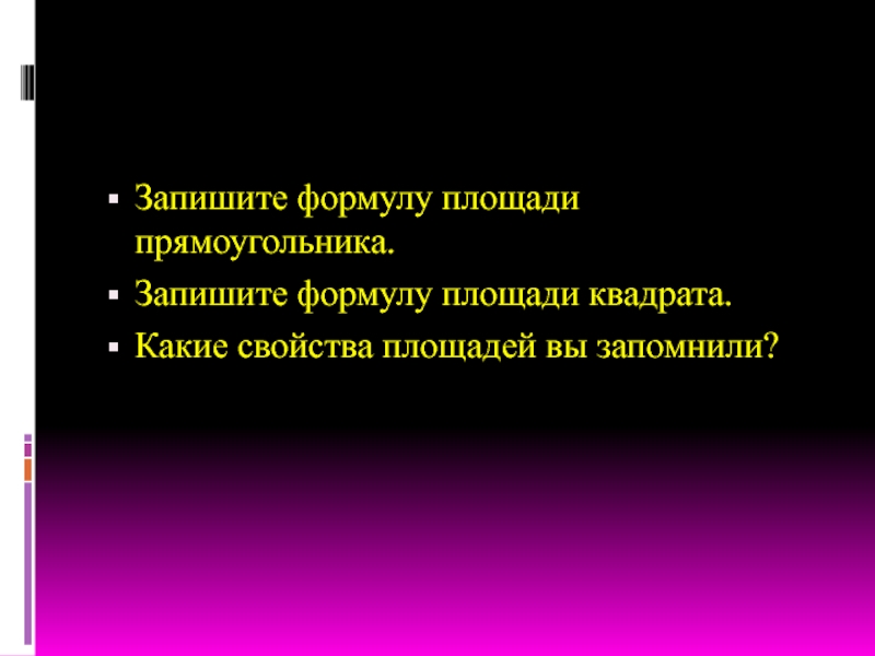 Запишите формулу площади прямоугольника.Запишите формулу площади квадрата.Какие свойства площадей вы запомнили?