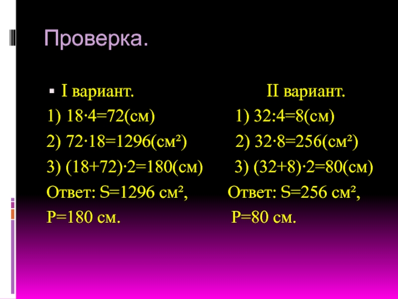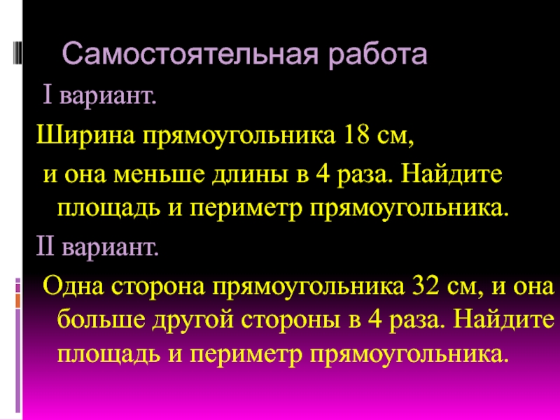 Самостоятельная работа I вариант. Ширина прямоугольника 18 см, и она меньше длины в 4 раза. Найдите площадь