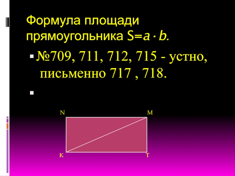 Формула площади прямоугольника S=a∙b.   №709, 711, 712, 715 - устно,  письменно 717 , 718.