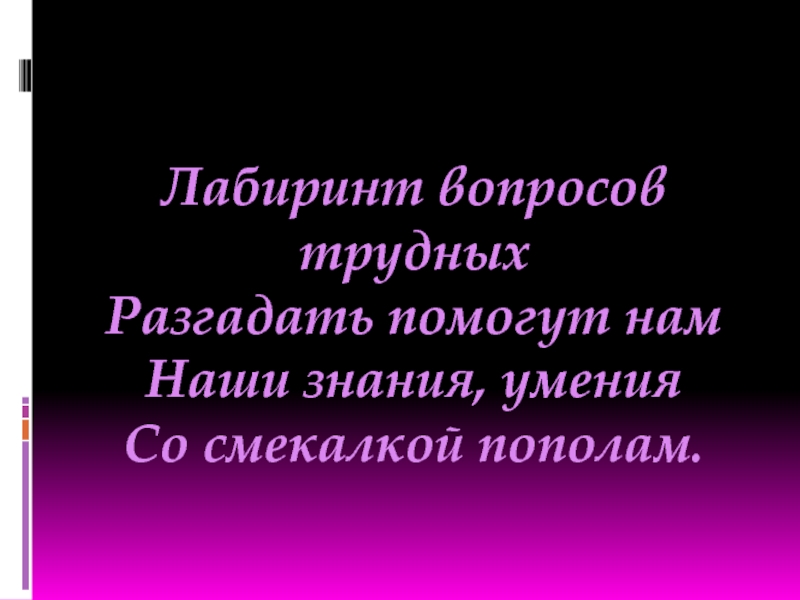 Лабиринт вопросов трудных Разгадать помогут намНаши знания, уменияСо смекалкой пополам.
