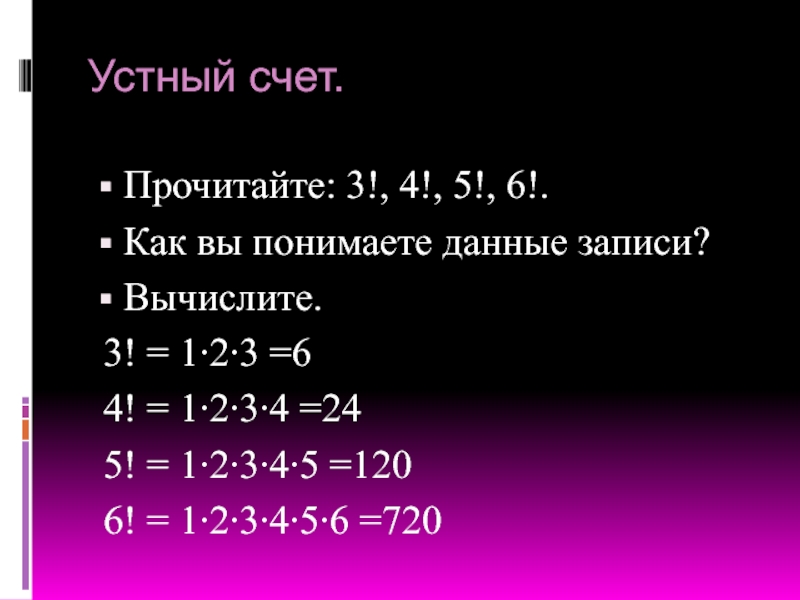 Устный счет. Прочитайте: 3!, 4!, 5!, 6!.Как вы понимаете данные записи?Вычислите. 3! = 1∙2∙3 =6 4! = 1∙2∙3∙4 =24 5! = 1∙2∙3∙4∙5 =120