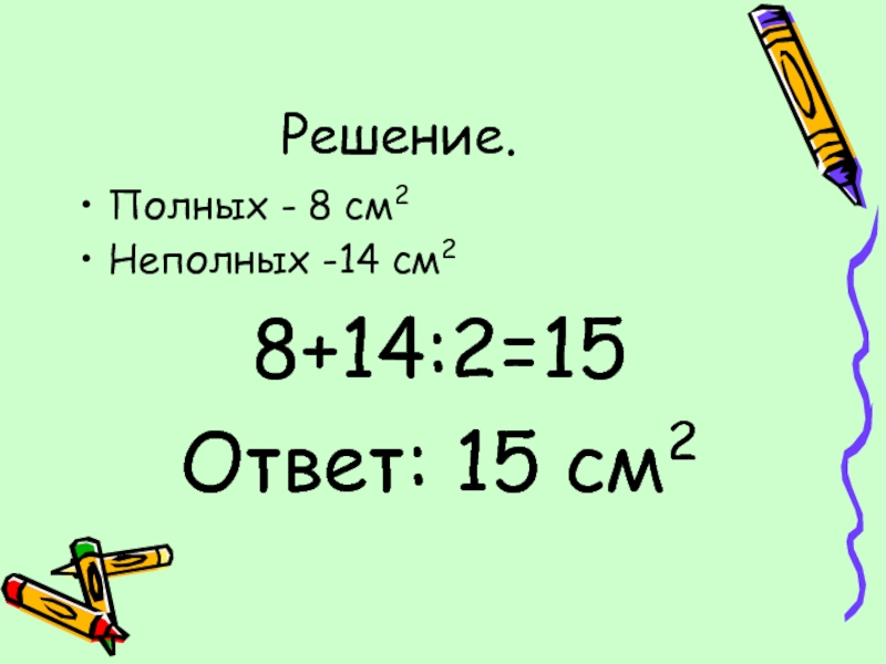 Решение.Полных - 8 см2Неполных -14 см28+14:2=15Ответ: 15 см2