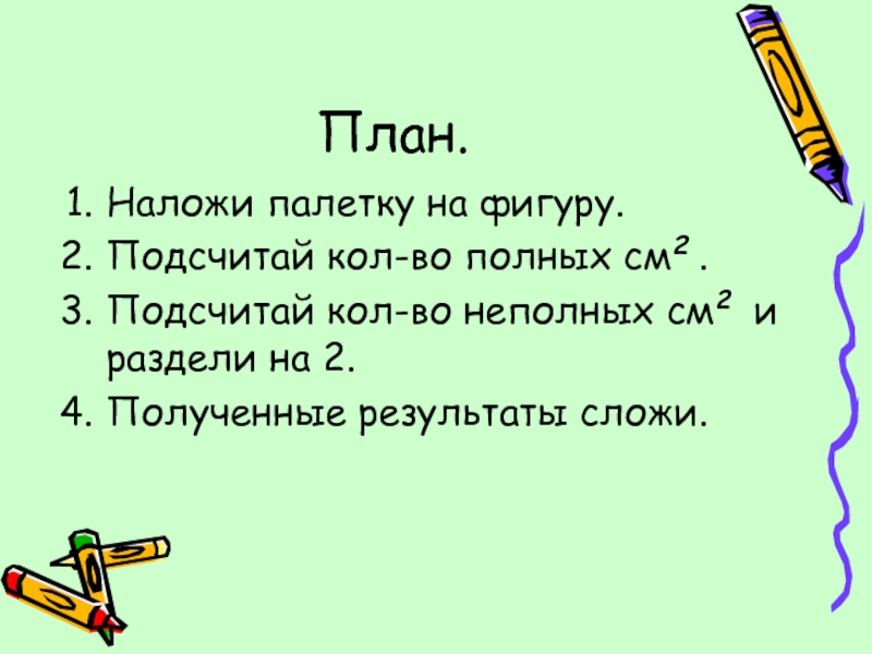 План.Наложи палетку на фигуру.Подсчитай кол-во полных см2 .Подсчитай кол-во неполных см2 и раздели на 2.Полученные результаты сложи.